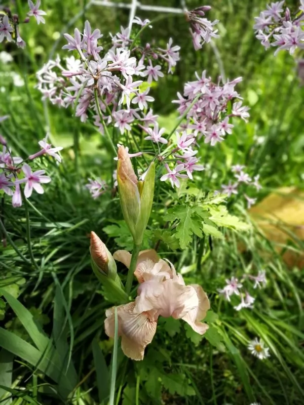 Tulbaghia cominsii (dietro) e Iris nano rosa- Foto di Tiziana Sanna