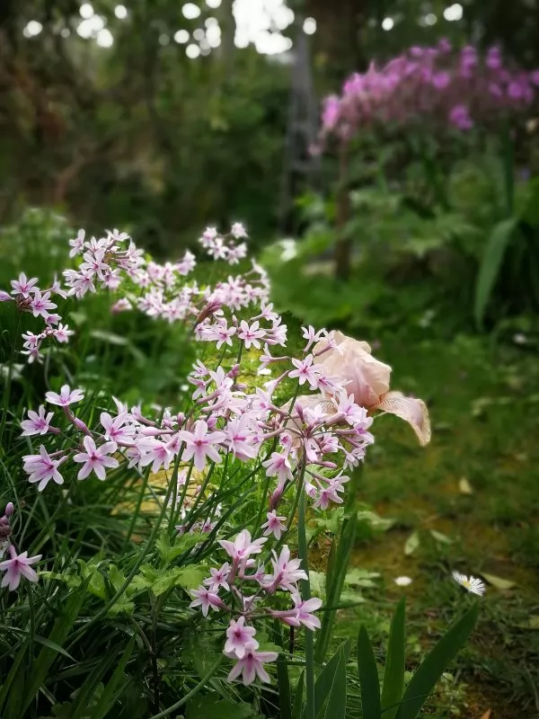 angolazione della Tulbaghia cominsii e Iris e sullo sfondo la fioritura del Geranium maderense- foto di Tiziana Sanna